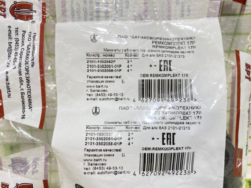 Ремкомплект цилиндра тормозного заднего ВАЗ 2101-07, 2123 NIVA CHEVROLET Производитель: БРТ РОССИЯ Новый Аналог (складские остатки) 21010-3502051-01, 21010-3502051-00, 21010-3502058-01, 21010-3502058-00, 21010-1602592-00