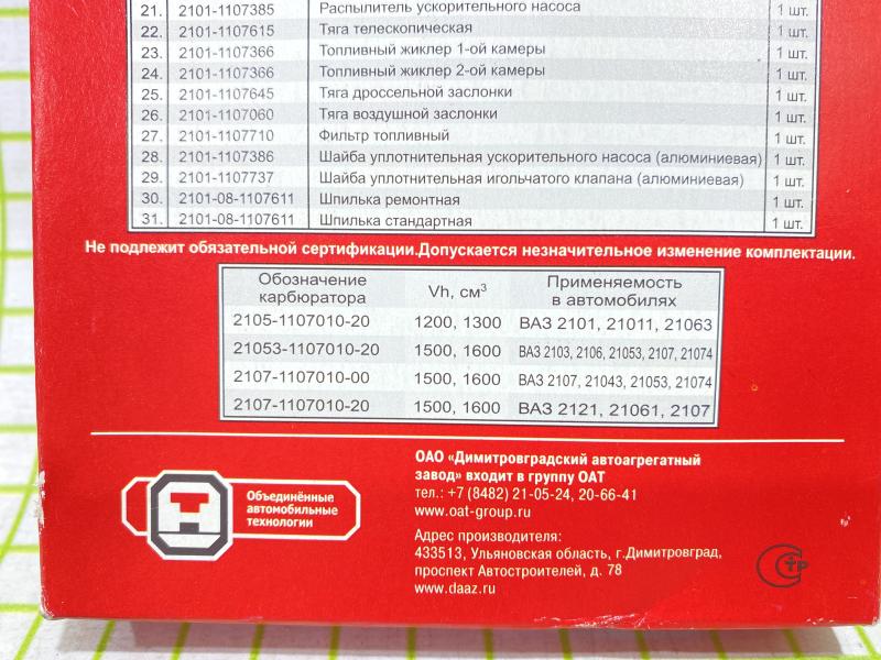 ДААЗ ремонтный комплект карбюратора тип (Озон) ВАЗ 2105-20 Производитель: ДААЗ РОССИЯ Новый Аналог (складские остатки)